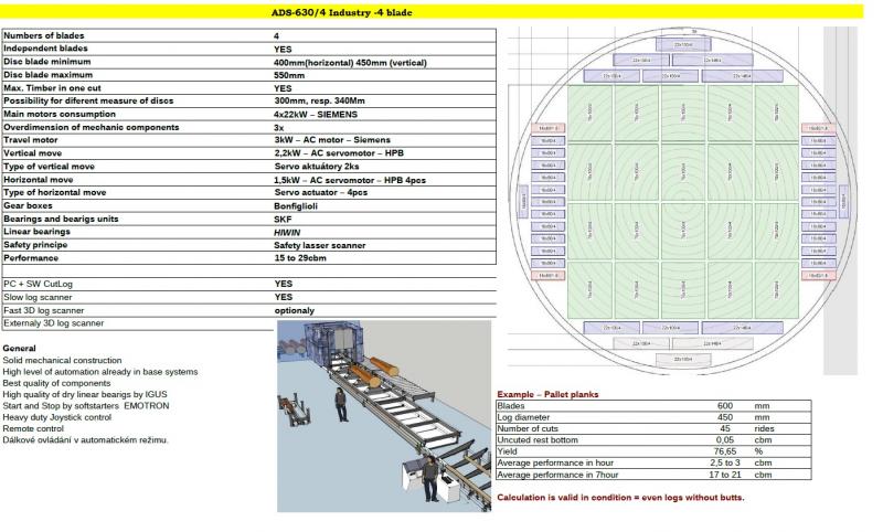 Salg / tilbudTrebearbeidingsmaskiner > Dobbelsagbladet vinkelsagProdusent og type : Drekos made s.r.o Stand : Brukt Strømforbruk : 44 kW Versjon : Dobbeltbladsag Sagbladdiameter : 450, 500, 550 mm Stammediam. (min-maks) : 250 - 1000 mm Stammelengde (min-maks) : 2500 - 10000 mm Maks tredimensjoner : 200 x 200 mm Produksjonsår : 2022